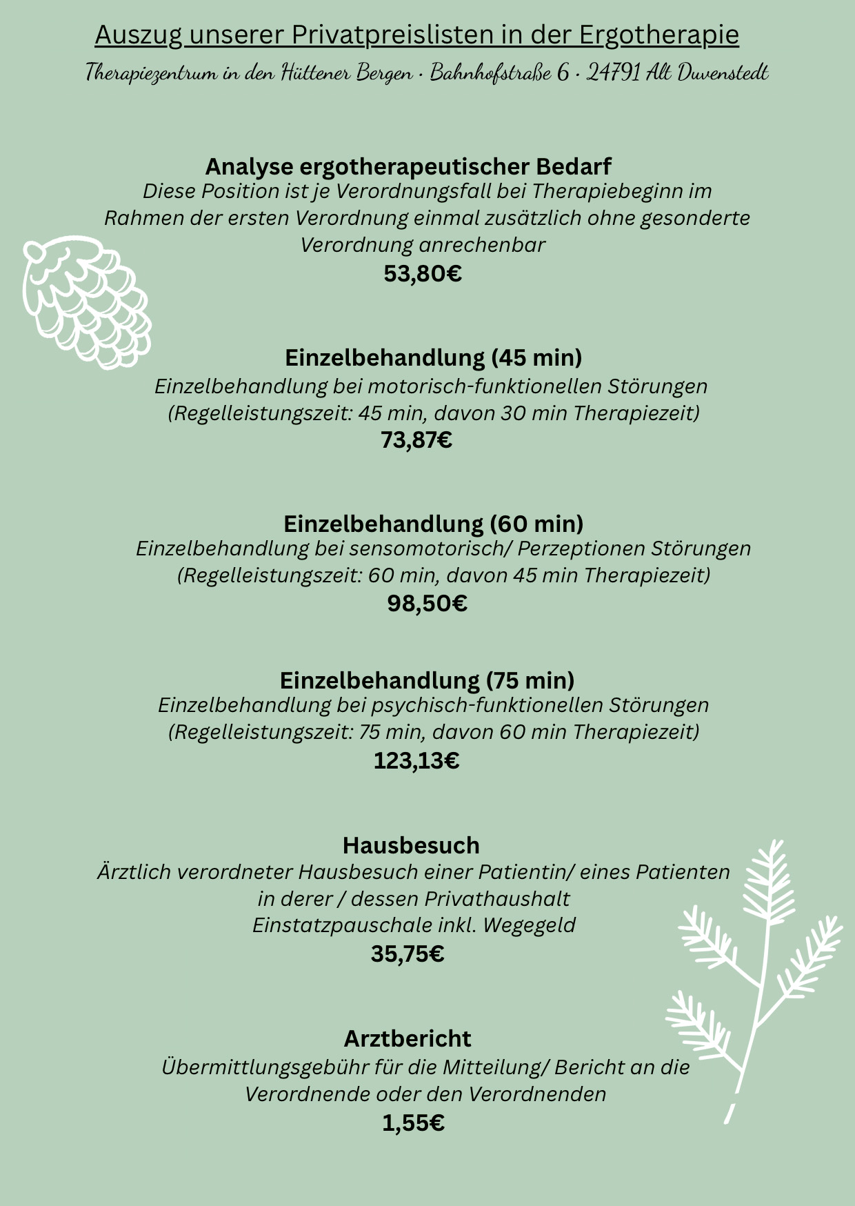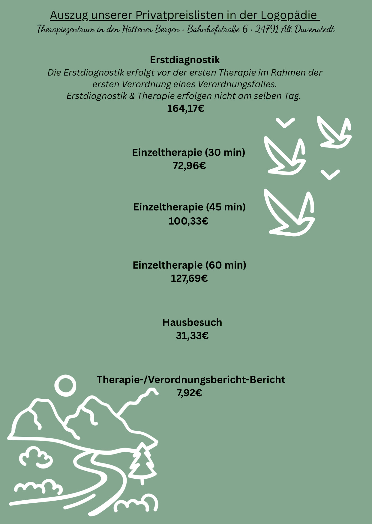 Wir bitten Sie um Verständnis dafür, dass wir uns in der Preiskalkulation für Patientinnen & Patienten, welche nicht der gesetzlichen Krankenversicherung zugehörig sind, nicht zwangsläufig den Gebührensatz der gesetzlichen Krankenkassen für unsere Leistungen einordnen. Als Heilmittelpraxis sind wir als Unternehmen nicht staatlich gefördert oder bezuschusst und existieren nicht als Teil des öffentlichen Gesundheitswesens (im Gegensatz zu anderen Institutionen & Einrichtungen in der Gesundheitsbranche). Als Einzelunternehmen haben wir die Freiheit und die Notwendigkeit unsere Preise so zu kalkulieren, dass diese mit unseren Aufwendungen, Investitionen & Kosten für die Behandlungseinheiten im Einklang stehen. So ist es möglich, dass sich Preise (über)regional voneinander unterscheiden und nicht zwangsläufig deckungsgleich sind. Mehr Informationen entnehmen Sie gerne dem Flyer Patienten- Information zur GebüTh - Gebührenübersicht für Therapeuten oder sprechen uns persönlich an.